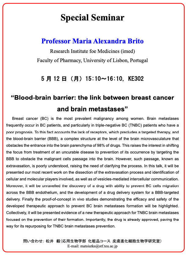 2025年5月12日にMaria Alexandra Brito教授(リスボン大学)の講演会” Blood-brain barrier: the link between breast cancer and brain metastases(血管脳関門:乳がん細胞の脳への浸潤性について)”が開催されました。